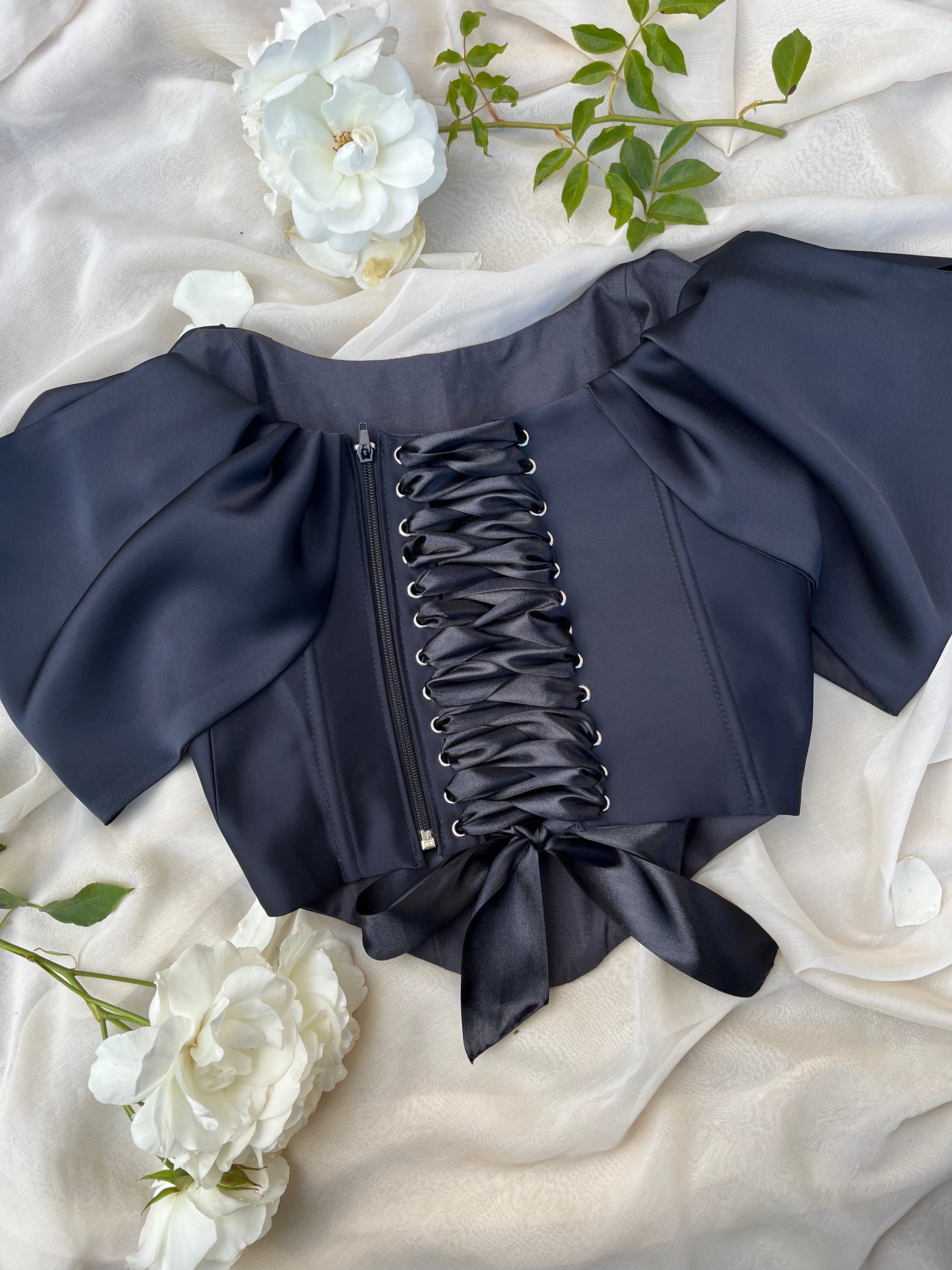 Corset de arte tipo strapless con mangas drapeadas bajo el hombro, confeccionado a medida con satín charmeuse y cintas ajustables a tono. En combinación con los estampados de artistas clásicos como Botticelli o Monet, puedes crear tu propia obra en combinación con negro, marfil y burdeo para lucir como siempre soñaste.