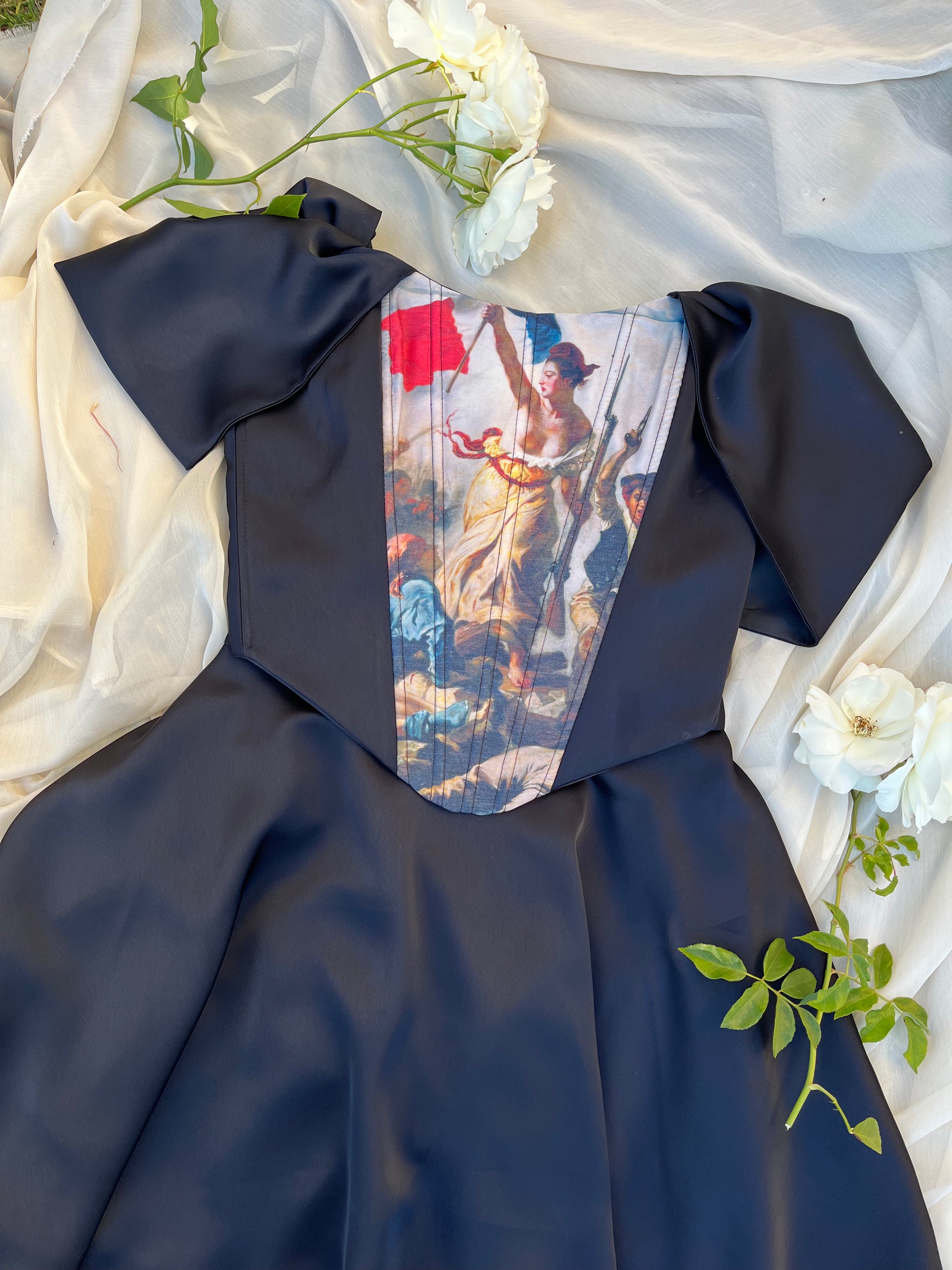 Conjunto de arte confeccionado a medida, que consiste de un corset con estampado central y mangas drapeadas bajo los hombros, junto. una falda de ruedo amplio del mismo color. Entre los estampados de Van Gogh, Monet, Degas y mucho más, puedes elegir el mundo creado en el cual sumergirte con tu conjunto Louvre.